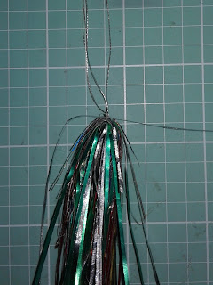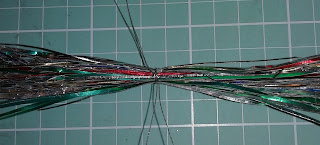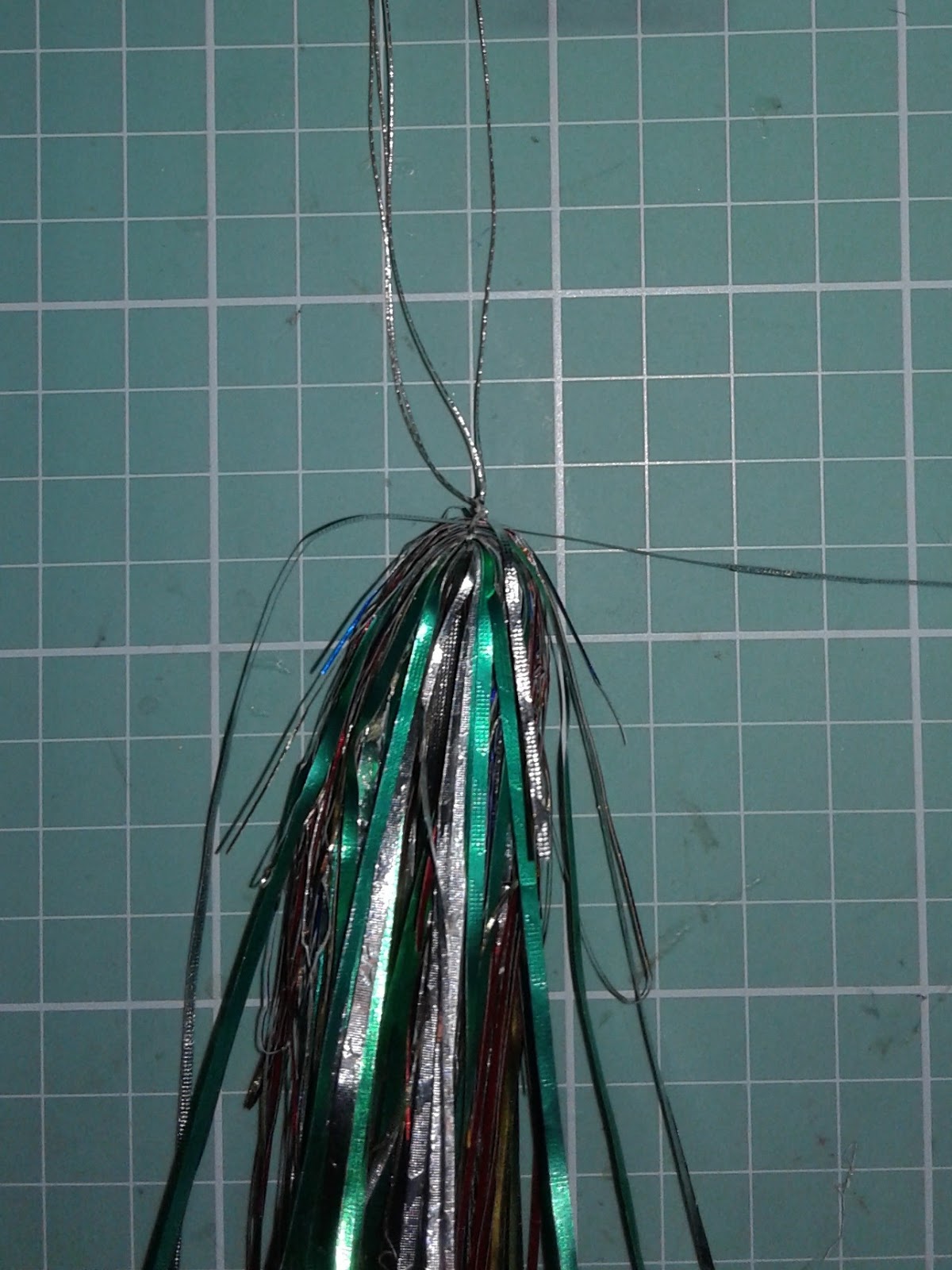 Step 5: Creating the Angel streamers - Rinea sells the thin pieces of foil on their Creativity Kits in the kit they are called Foil Shreds. I took some of the Foil Shreds - mostly the Silver, Gold, Ruby and Emerald - tied them in the center with 4" of Metallic thread - sort of creating a tassel.