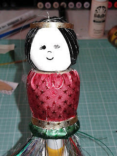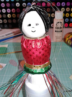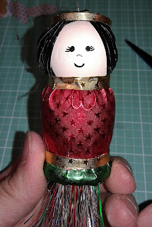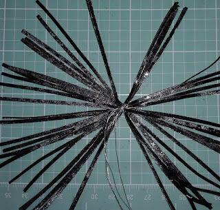Step 6: Creating the Angel's Hair: I repeated the steps above to create the tassel - this time using some Ebony Starstruck Foil paper and 8" of metallic thread. Then, spread the Foil paper out a bit so that it's easier to place on the doll head. Adhere with a bit of hot glue. Tie off the making sure to tie off the ends to create a hanger for the angel.