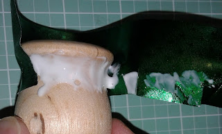 Step 3: Cut small slits into the Emerald starstruck Foil Paper on one side - this will make easier to adhere the paper to the wooden cup. Run a bead of glue at the bottom curved part of the wooden cup. Slowly work the paper onto the cup.