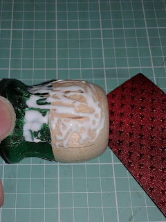 Step 4: Repeat the above process but no need to cut slits into the paper. Using the Ruby Starstruck paper adhere it to the cup. Next, Take one of the Gold Starstruck strips and adhere it to the cup. covering the seam between the Emerald and Ruby Starstruck papers.