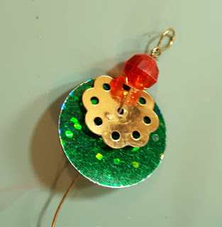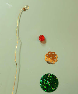 Then, I add the other green sequin, followed by the gold sequin and finally the red bead. I trim off any extra wire. leaving just enough to create the loop in the wire.