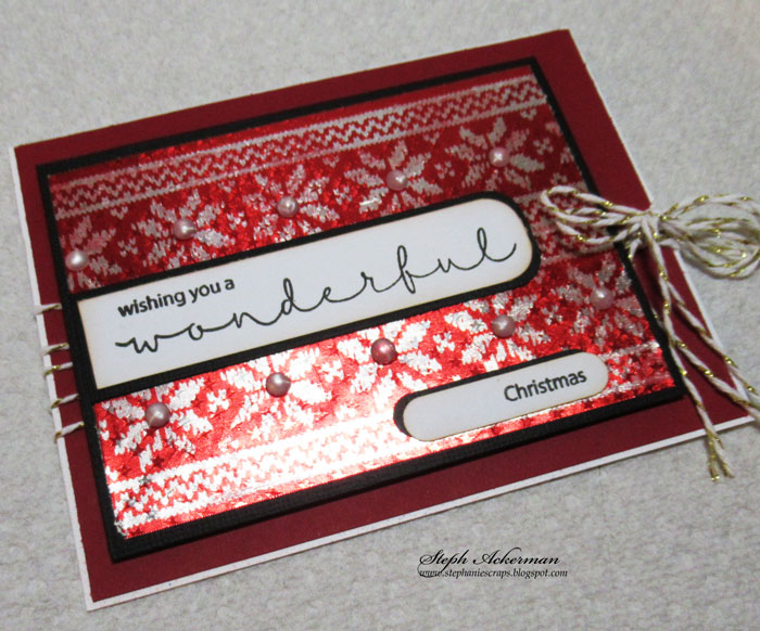 I matted the panel with cardstock and added it to the card with pop dots. Pearls were placed in the center of each poinsettia and added the phrase between the stamped images.