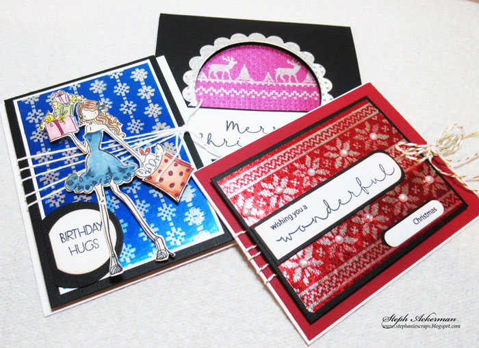 I stamped the background images with Ghost Ink on Saphire/Gold Glossy Foiled Paper. Once stamped, I used a baby wipe to remove the color and had this amazing background.