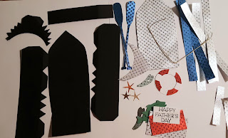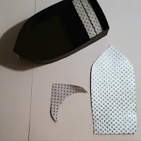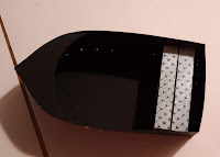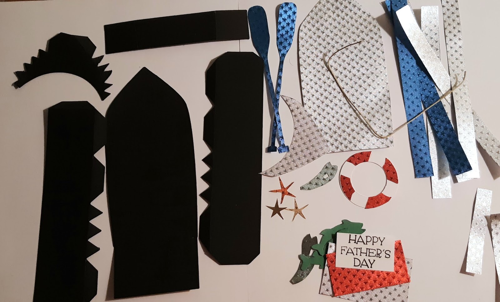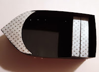 I cut out all the pieces to the box from the black cardstock. The outer panels of the boat, the fish scales, the starfish, the red portion of the life preserver and the outer part of the oars I . cut from the Foil paper.
