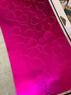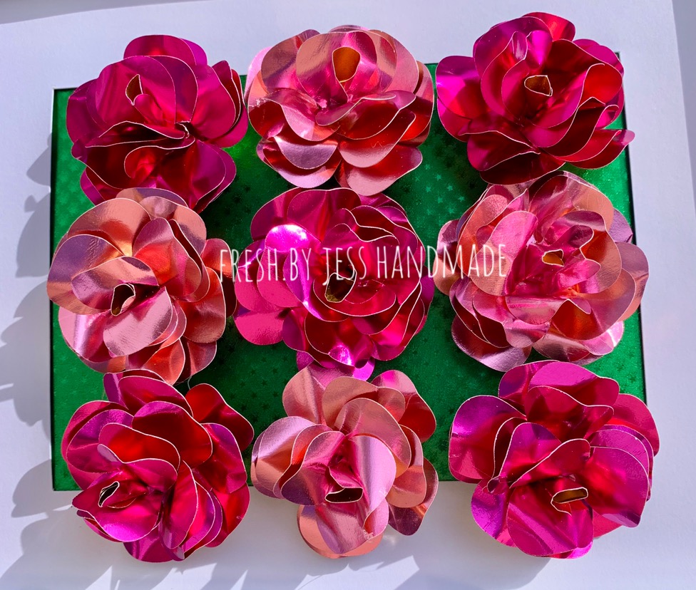 Once my roses were all cut, I used double-sided tape to adhere all my layers. I made nine flowers in total. I shaped the petals as I went - that is the most awesome part of using Rinea Foiled Paper - it HOLDS it's shape! Plus, once you have all the flowers built, you can still arrange and re-arrange the petals until you have it to your liking!
