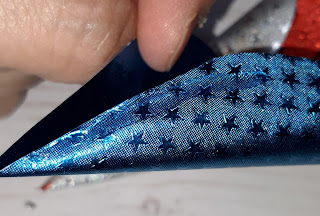 Next, I put a bit of glue on the back of the Ruby/Ruby Starstruck Foil Paper cone and the Silver/Silver Starstruck Foil Paper cone and insert them into one another. Then, I added them into the Sapphire/Sapphire Starstruck Foil Paper cone. I repeat this for all 12 shapes.