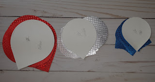 I then traced and cut the water drop shapes onto the Foil paper 12x in each color. I did the large shape in the Ruby/Ruby Starstruck Foil Paper. The medium one in Silver/Silver Starstruck Foil Paper and the small in the Sapphire/Sapphire Starstruck Foil Paper.