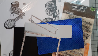 I gathered all the supplies and then I die cut the Rinea Foil Paper: Starstruck Cobalt with Lawn Fawn Cross-Stitched Rectangle Die and the Rinea Foil Paper: Glossy Arctic White/ Gold with the MFT Stitched Fishtail Sentiment Strip. I also punched out the Craft UK Vintage Bikes pieces I needed.