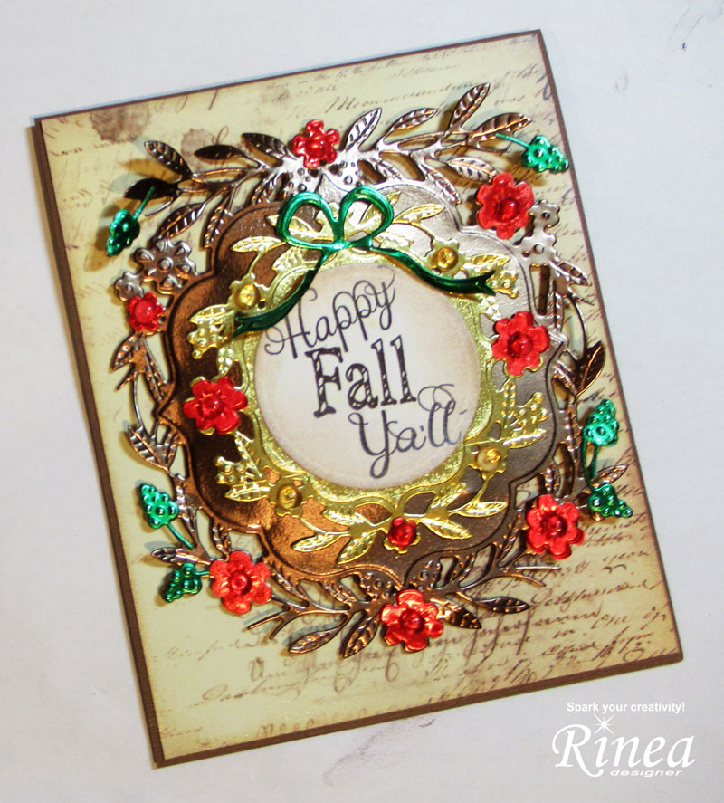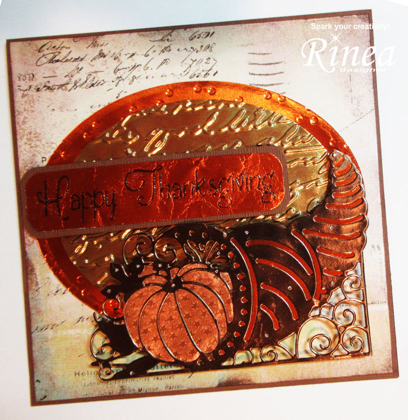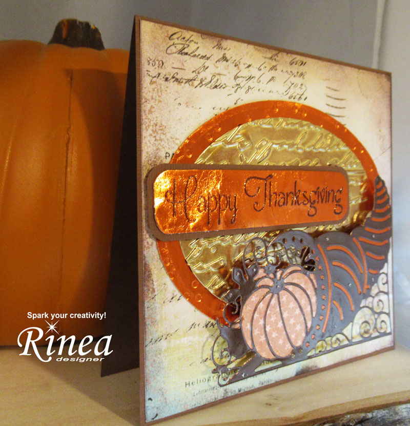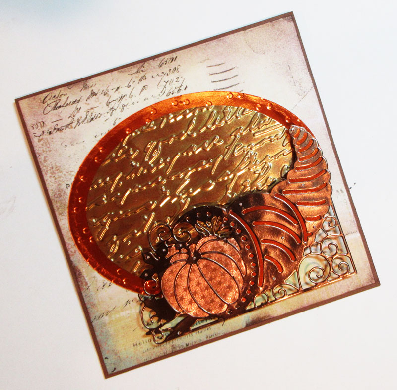 I then die cut an oval from Marigold and embossed it with a Cuttlebug embossing folder. A smaller oval was die cut from Gold Foil (you can use the reverse side of any of the foils) and embossed with a script embossing folder. I placed the cornucopia on the oval, leaving the corner edge free.