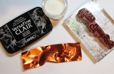 Happy Thanksgiving from So Suzy/Crackerbox stamps was stamped with VersaFine Clair Nocturne Ink on Marigold. Embossing power was added, and the panel was heat set. Because foil buckles in the heat, I had this funky effect.