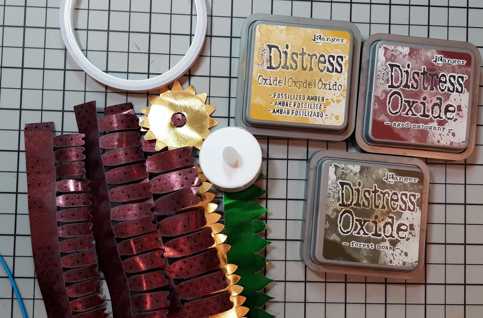 Next, I inked the center Rinea: Gold/Gold Glossy Paper with Distress Oxide ink Fossilized Amber, followed by the Rinea: Merlot/Merlot Starstruck Foiled Paper petals in Distress Oxide ink in Aged Mahogany and the Rinea Emerald/Gold Glossy Paper leaves with Distress Oxide ink in Forest Moss. I do this for extra definition and to hide the white core of the Rinea Foiled Paper. I then applied Imagine Crafts tear it tape to all the pieces.