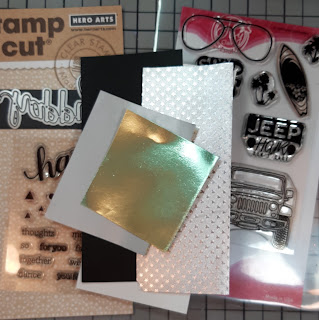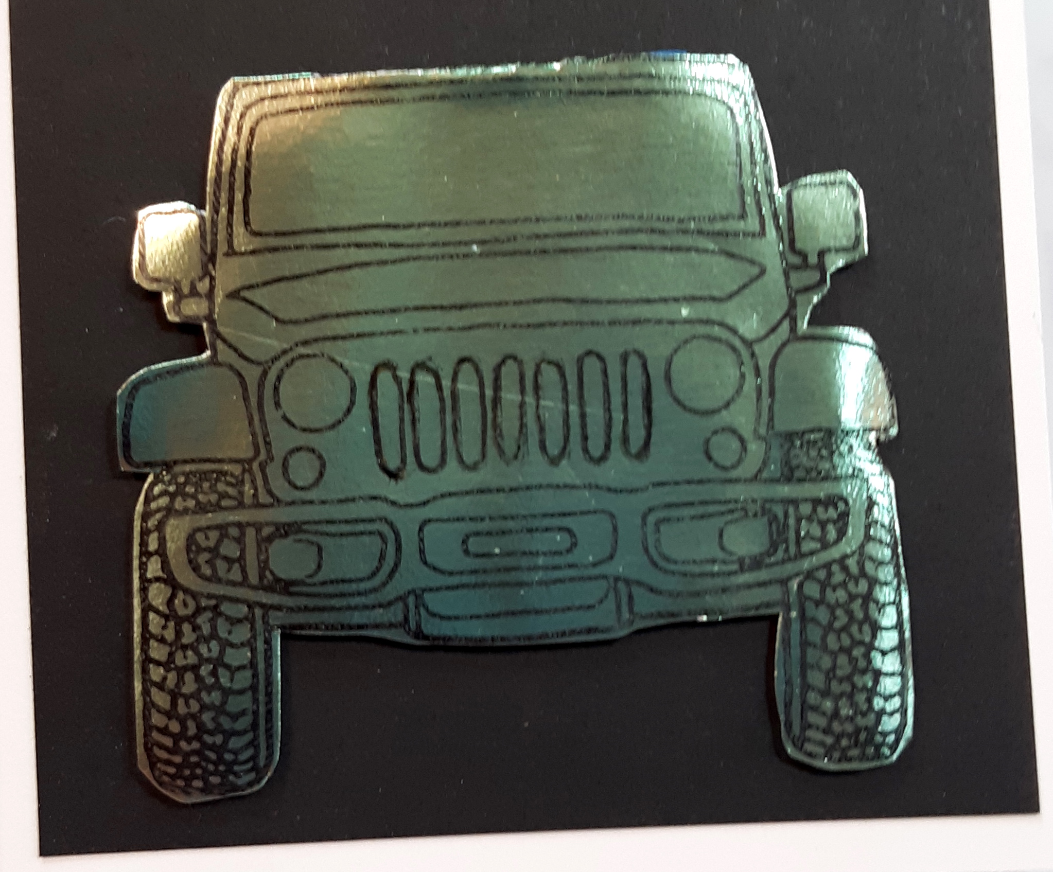 Then, I stamped the Jeep image onto the Rinea Foiled Paper: Jade/Gold Glossy