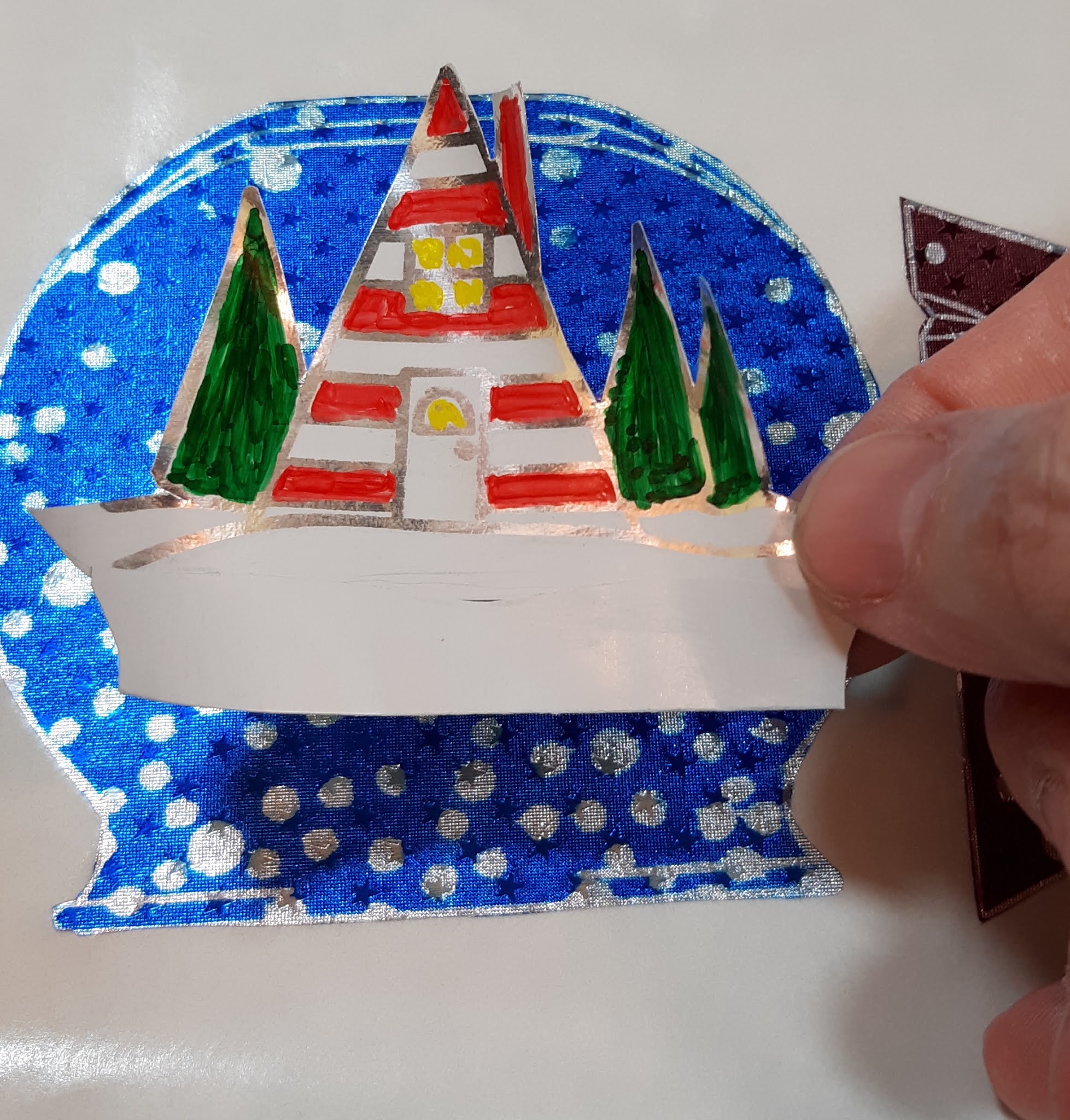 I then stamp the globe onto the snowy background. I then trim the globe. I then stamp the cork onto Rinea Starstruck Foil Paper: Merlot/Merlot using the Rinea Ghost Ink 2.0. I also stamp the Crackerbox & Suzy Stamps: Cottage & Trees onto the Rinea Glossy Foil Paper: Arctic/ Gold. Next, I wipe off the excess ink of the cork stamped image and the cottage.