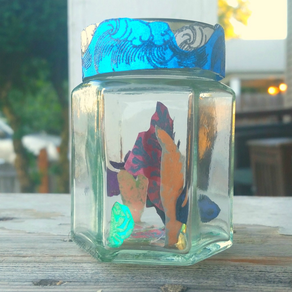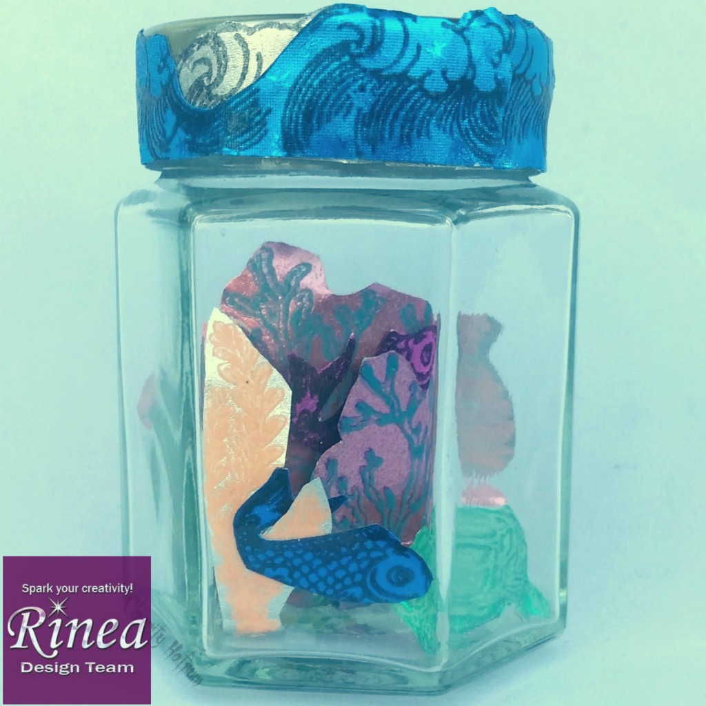 A delightful, worry free aquarium is just an empty jar and quick how-to away! Charity here, no need to know all about salt water fish and how to keep them happy. Just round up some stamps, pigment ink, and your favorite colors of Rinea Foiled Paper for a worry free beauty made by you!