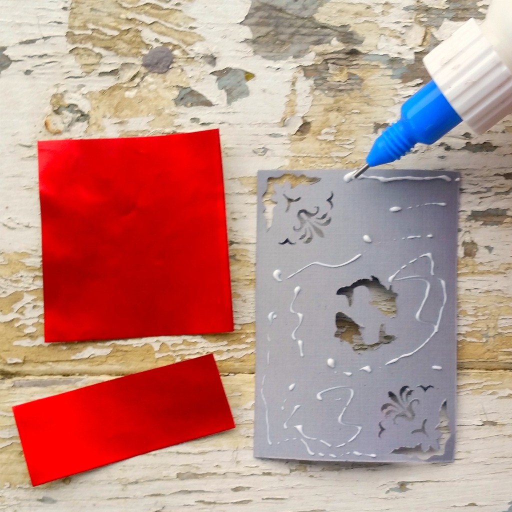 I used the Best Glue Ever from ScraPerfect to hold the slippery foiled paper onto the cardstock. Because the glue is so strong I only needed this dots and lines.