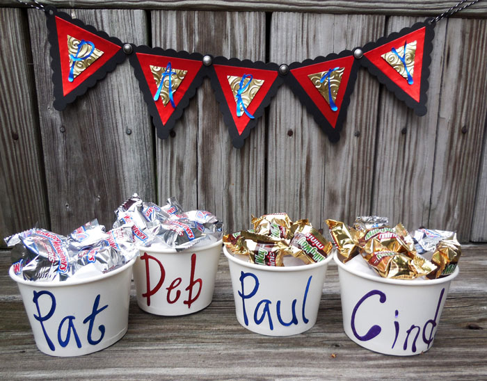 I decided to decorate paper bowls with the attendees' names. I die cut the letters from Rinea Foiled Papers using Ruby/Gold Glossy, Saphire/Gold Glossy and Violet/Violet Star Struck Foiled Papers with Sizzix dies. They die cut beautifully.