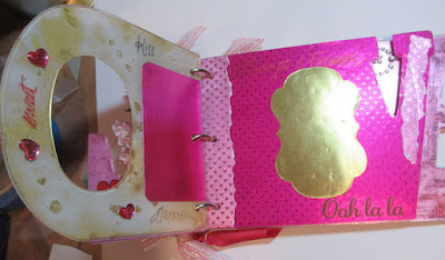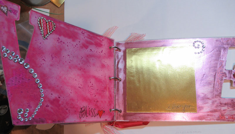 Cut Starstruck Blush to fit the "L". Add a doily heart to the front and a rub-on along the bottom edge.