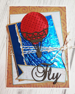 Using chipboard elements from the Robin's Nest, I inked each with Memento Ink. I cut a hot air balloon from Ruby/Ruby Star Struck Foiled Paper then added it to the hot air balloon basket frame and placed it over the twine.
