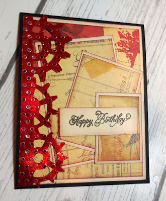 Needing a masculine birthday card, I die cut a border of gears from Ruby/Ruby Star Stuck Foiled Paper.