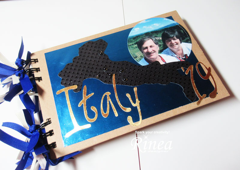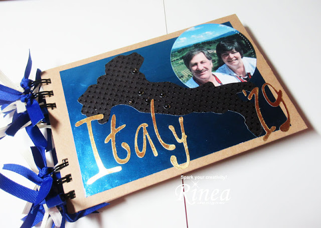 I wanted to document our recent trip to Italy, so I chose to create a mini album. I added Sapphire/Gold Glossy Foiled Paper to the album cover, then fussy cut Italy from Ebony Starstruck, Italy and '19 were then die cut from Gold/Glossy Foiled Paper using Sizix dies.