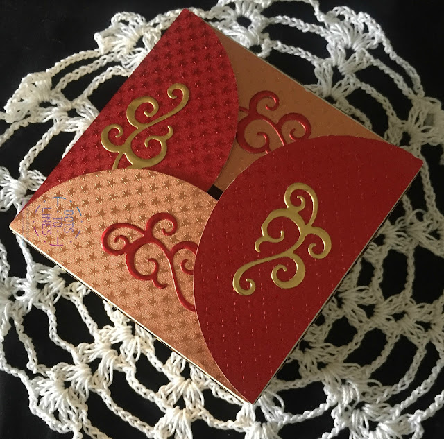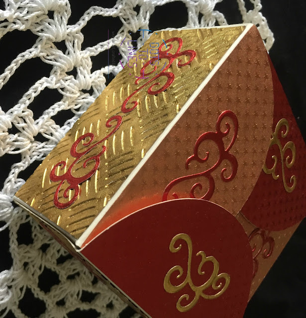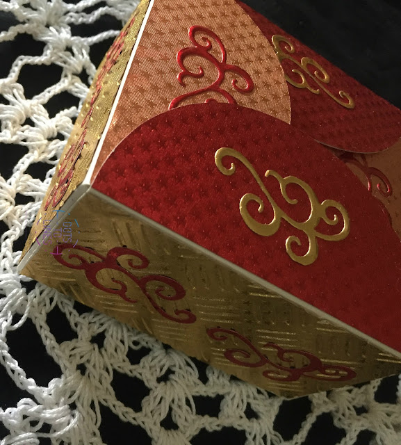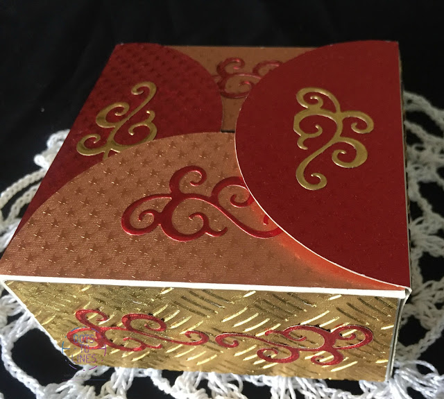 We used a ready die cut box and decorated it with Rinea Papers. We first cut for our sides and the top. Then, we ran the paper for the sides, through an embossing folder, to add some interest. We then adhered them to the base of the box. We finally die-cut some swirls with a contrasting paper and stuck them on the sides and the top to complete it. Doesn't it make a perfect gift for your loved ones!?