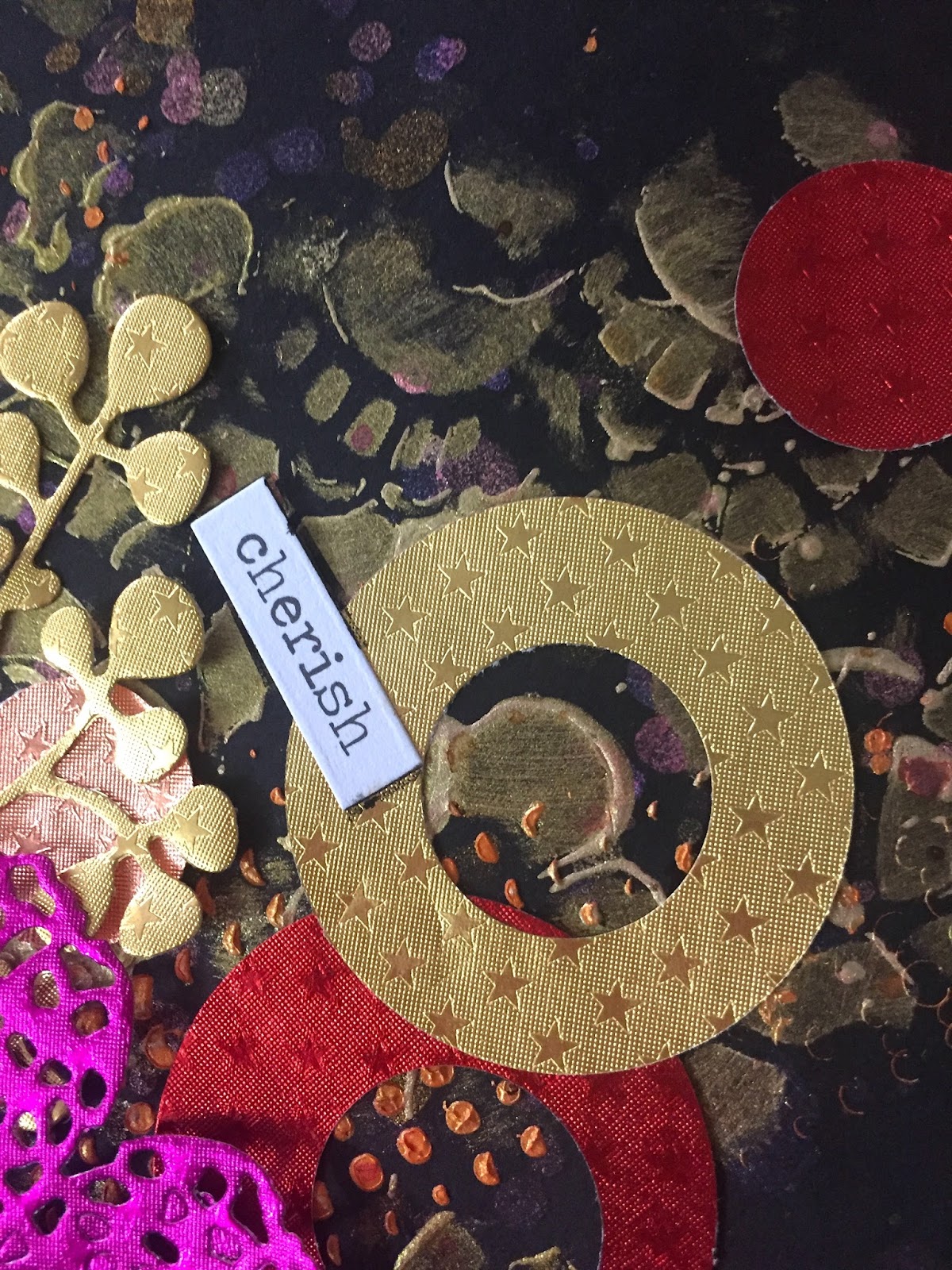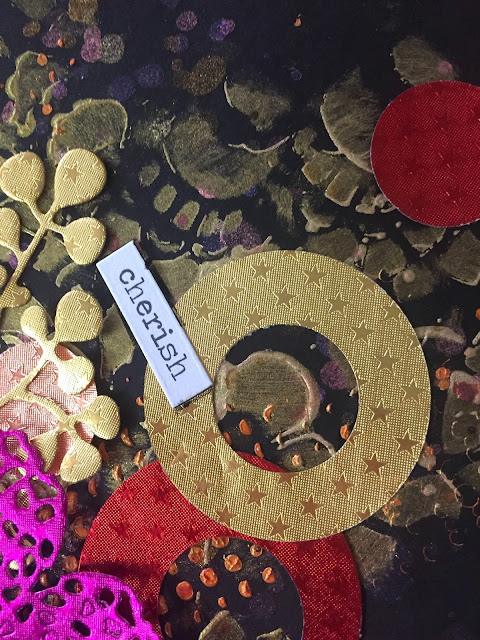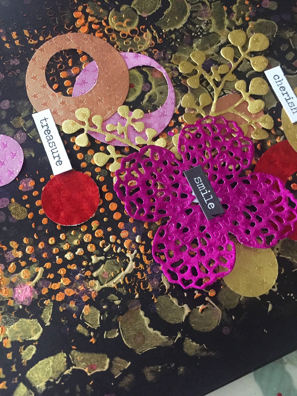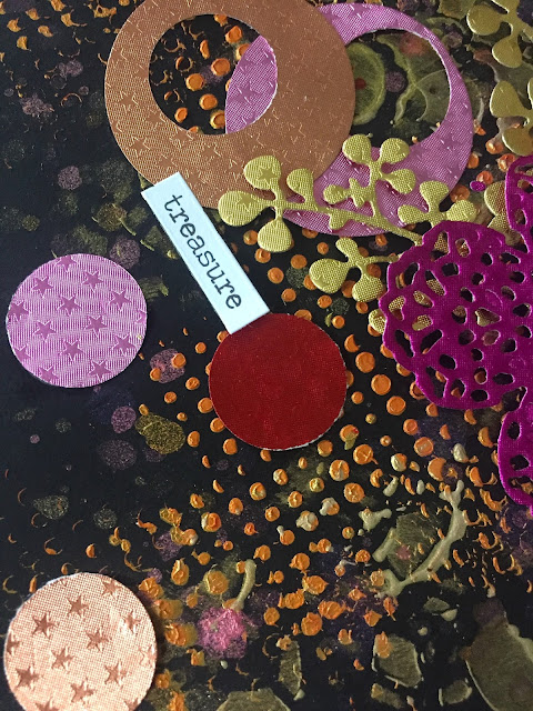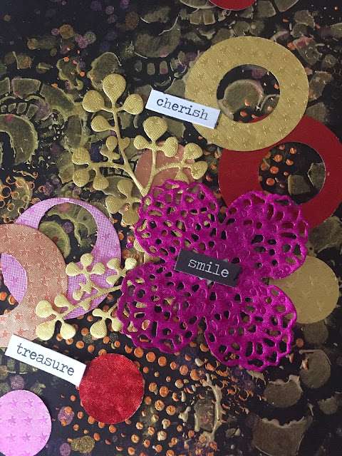 These papers were so pretty and vibrant that we decided to create a spread in our Black Book! For this spread, we've used two stencils and add some Art Alchemy paint through them for the background! We then used multiple Lindy's Sprays and added splatter randomly. Next, we punched circles from various colors of the foiled paper. We used two sizes so we could punch within the bigger circle as well giving us rings. We also die cut a few elements and layered all of these on our prepped background! We completed it with a few word stickers!