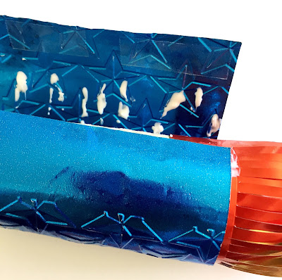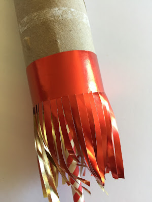 Adhere the fringe to the bottom part of your rocket with the tacky glue, but use a bit of double sided tape to secure the end flap. - Foil on foil.