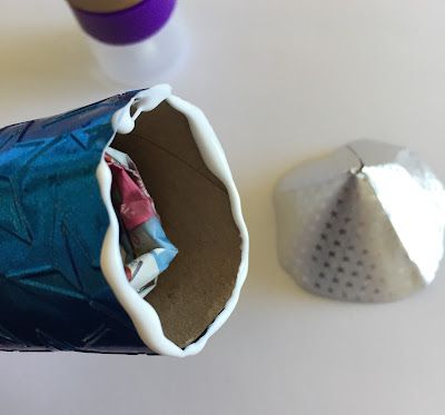 Trace a 4" circle onto Silver Star Struck. Cut this out, fold the circle in halves until you have four sections. Cut up to the center on one of the fold lines. Just like making a paper funnel, do the same with the circle until you achieve the rocket top you like. Secure shape with tape.
