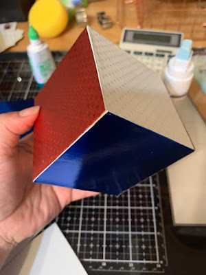 I used the Ruby Starstruck Foiled Paper, the BRAND NEW Cobalt/Gold Glossy Foiled Paper, and the Arctic Starstruck Foiled Paper for this project. You will also need a 3" cube (I had one in my stash, but you would use a small gift box or something similar) and glue.