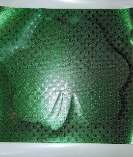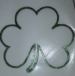 Then, I pressed the Rinea Emerald/Emerald Starstruck Foiled Paper onto the solid part of the Creative Embellishments: Shamrock Shaker Set which is the bottom of the shaker. I then trimmed the extra Rinea Emerald/Emerald Starstruck Foiled Paper away leaving the base covered. I did the same thing with one of the open shamrock pieces creating the top of the shamrock.
