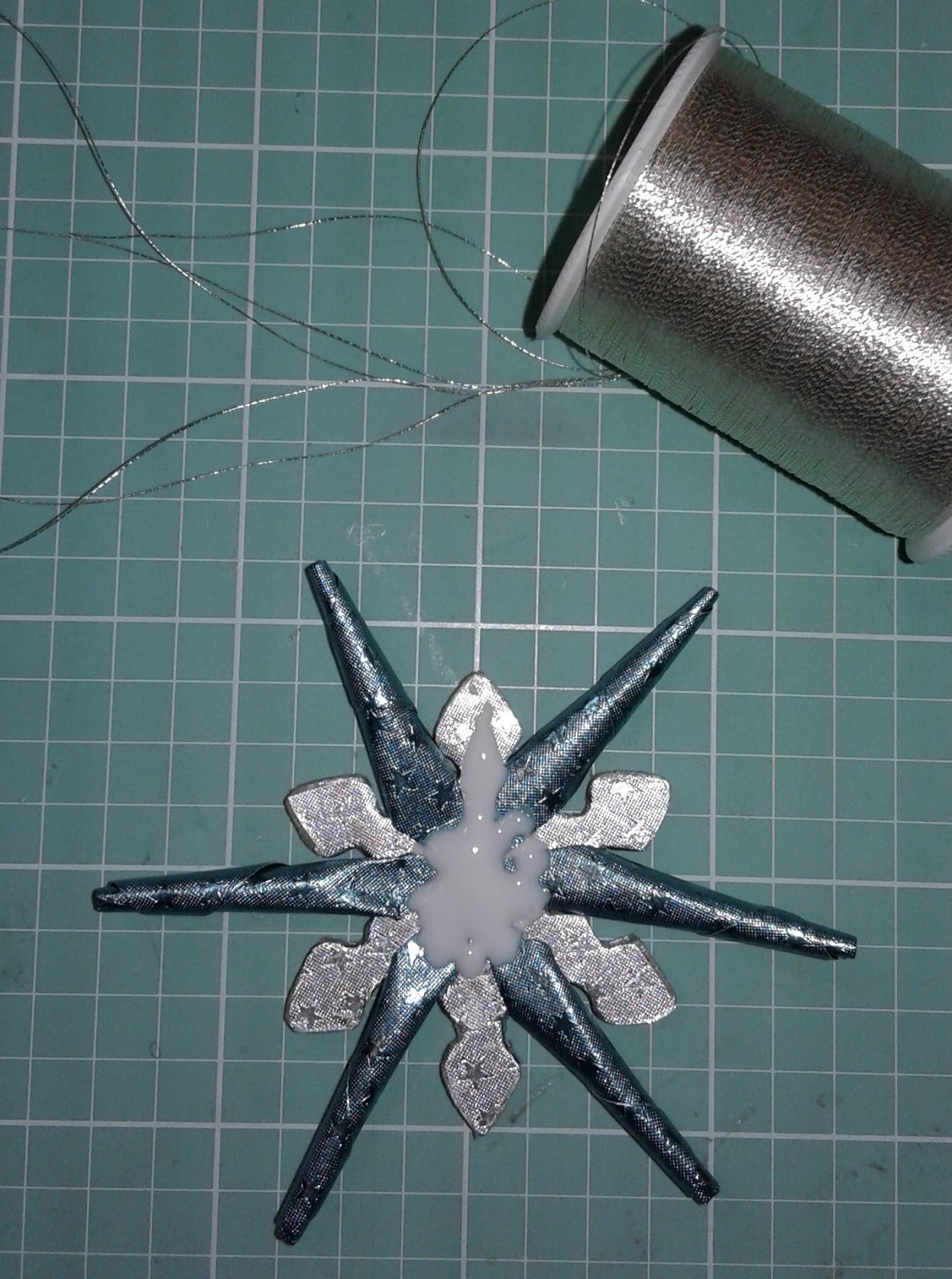 Step 5: Assembly of the snowflake - Start by cutting apart one of the rolled stars. Then, adhere the little cones onto the back of the wooden snowflake. *Note: you can use a glue gun and glue sticks for this process if you prefer unless creating this project with children. Next, cut a length of the silver thread - about 8 inches; then fold in half and tie off one end. Adhere it to the snowflake(this will be your hanger) try to center it.