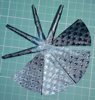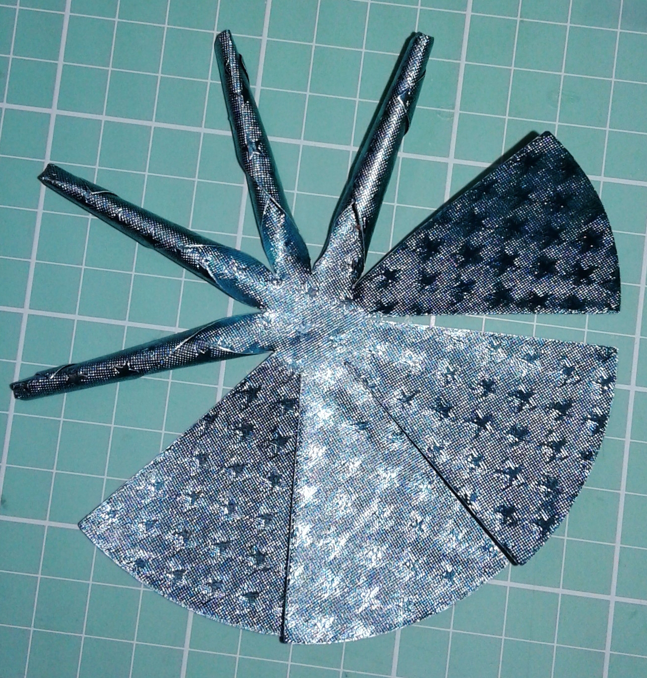 Step: 2 Using the Rinea 3D Rolled Star Die or Stars N More Templates to die cut 2 star maker shapes from Starstruck Turquoise. Using the handle of your paintbrush curl the circle edges as indicated on the back of the package. The best part of the Rinea Foil paper is that it holds its shape - but if you prefer you can add a tiny bit of glue. Set aside.