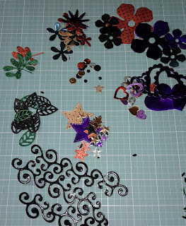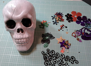 While the skull was drying, I die cut several hearts, flowers, leaves and swirls from the Haunted Variety Crafter's Pack, Violet/Gold Glossy Foil Paper, Turquoise/Gold Glossy Foil Paper.