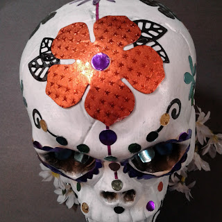 Next, I played around with my arrangement. I trimmed thin pieces of the Starstruck Fuchsia/Fuchsia Foil Paper I used it to down the front of the head to the tip of the nose. I just adhered the shapes to the skull with the Aleene's Clear Tacky Glue. The liquid glue gives you a bit of wiggle room to adjust the shapes as needed. What I do love about Rinea Foil Paper is that it holds it's shape. Which is perfect for those heart shapes around the eyes and the flowers inside of the eyes. Below are various photos showing all the shapes adhered to the skull.