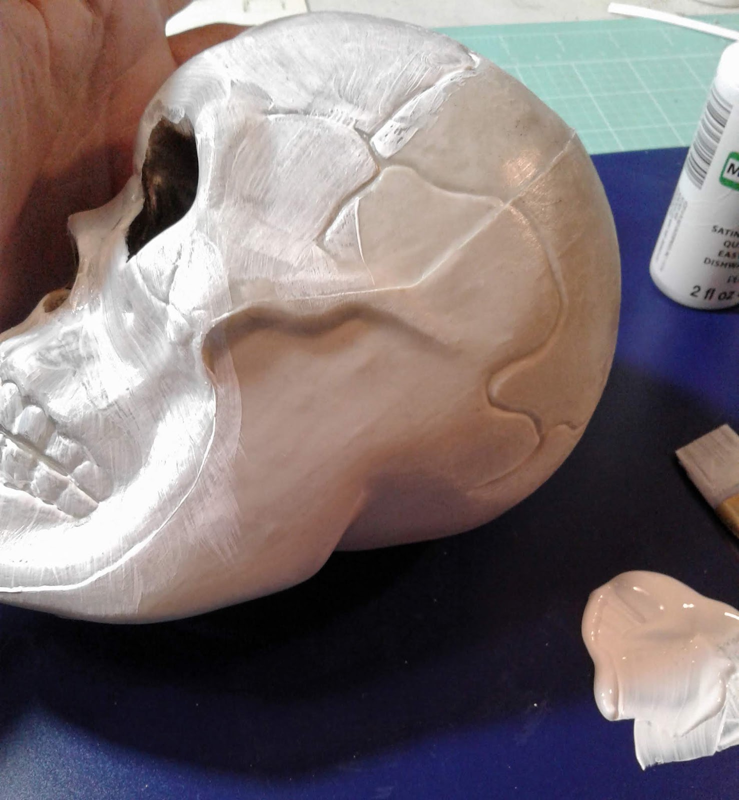 I started by painting my grayish skull white. With this paint by Plaid, you don't need to prep your surface. Which is perfect to work with kids or for those of us that love to jump right in. Then, I set it aside to dry.