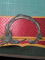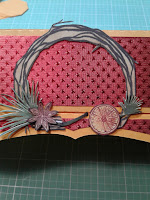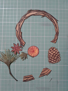 Once the Tealight Holder is assembled, I stamped the wreath & Pine Cone with Imagine Crafts Ganache Stazon Ink. Then, the Star Anise, Orange slice with Imagine Crafts Stazon Claret Ink. The Pine Boughs I did with Imagine Crafts Stazon Cloudy Sky I added a bit more color using Distress Oxide ink in Fozziled Amber and Evergreen Bough. I then cut the wreath toward the bottom so that it would fit my holder. I used the cut pieces to fill in where needed. I placed thin foam adhesive behind the pine cone and placed onto the holder in the center of the wreath.