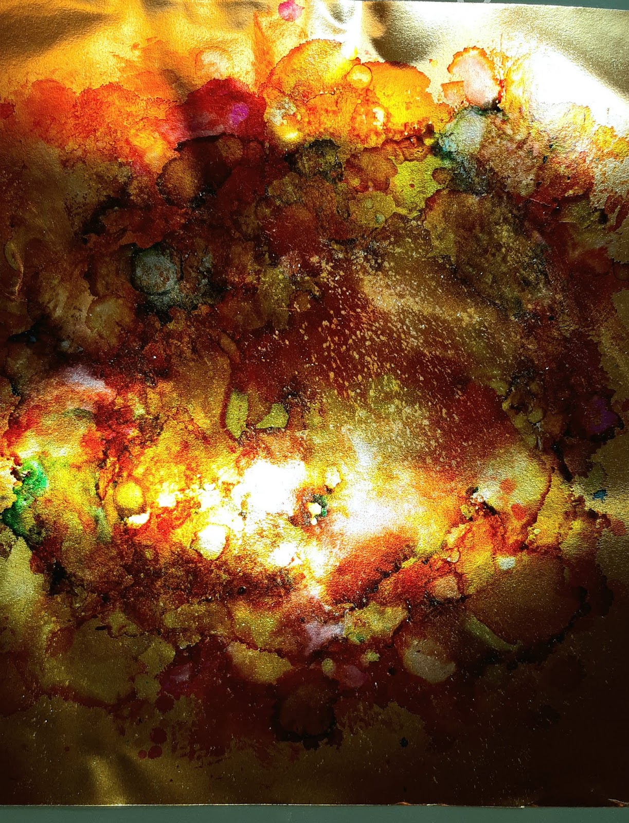 I added some of the alcohol inks to the Rinea Glossy/Glossy Gold 12x12 Foil Paper along with a bit of the blender solution to get a nice blend of the inks. I also added a tiny bit of gold Perfect Pearls dust will the ink was still wet. I set the Rinea Glossy/Glossy Gold 12x12 Foil Paper aside to dry.